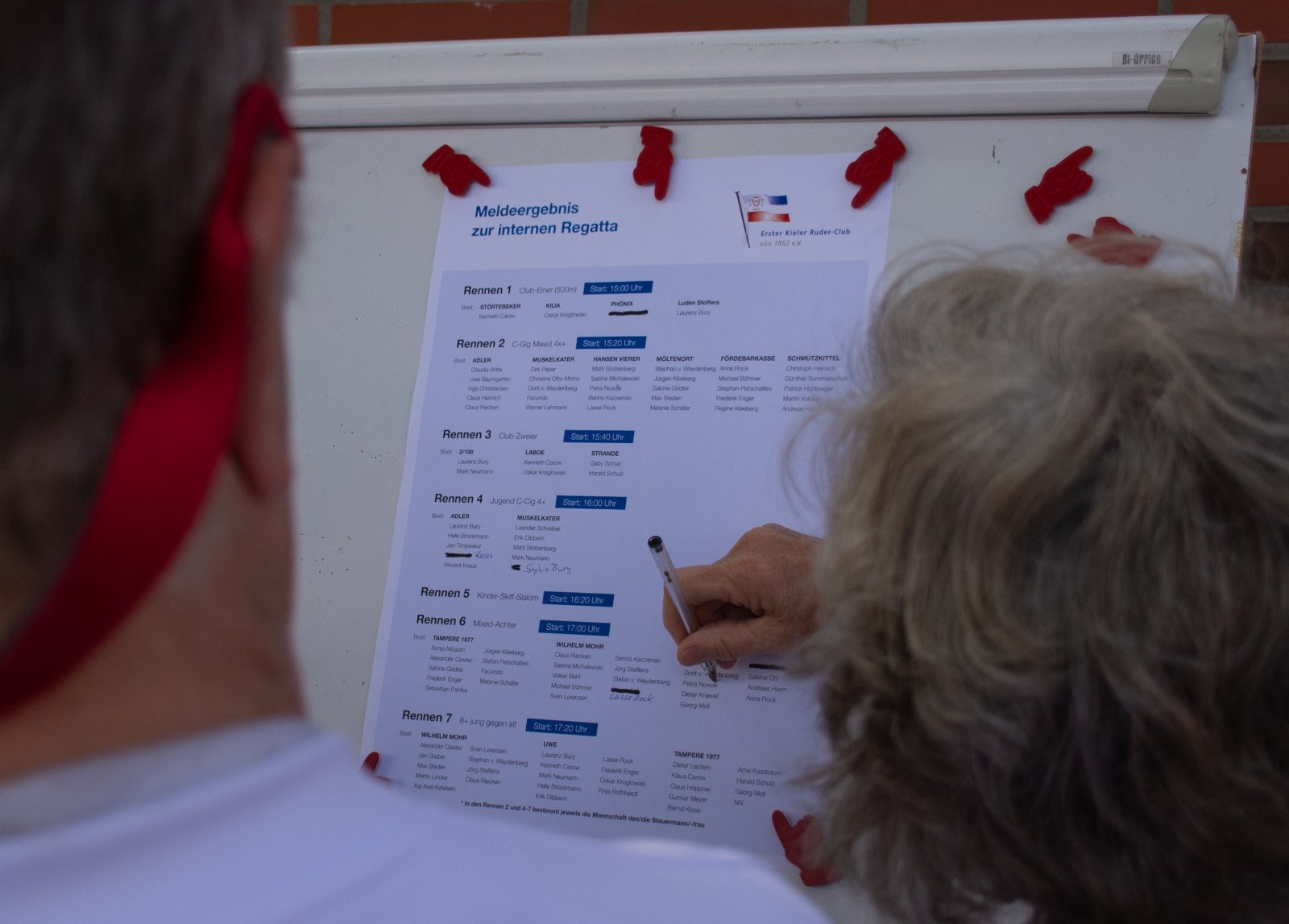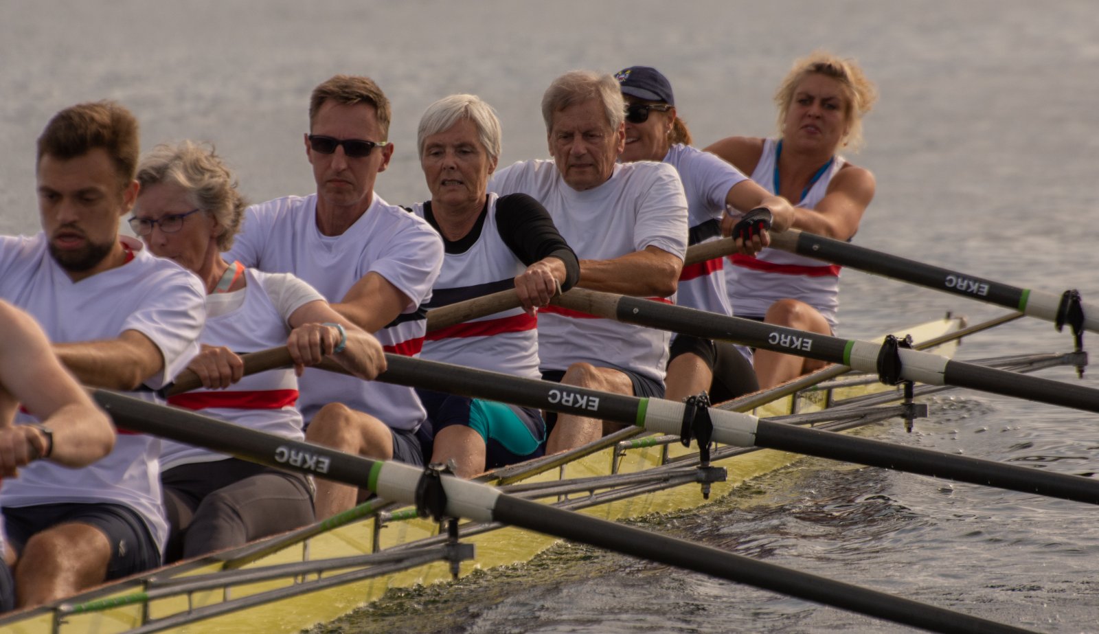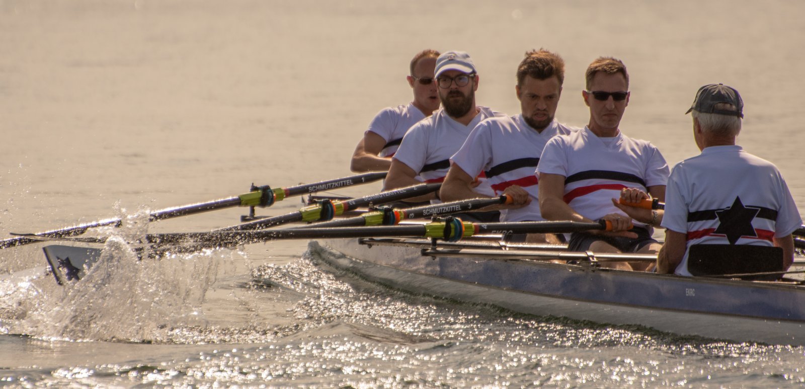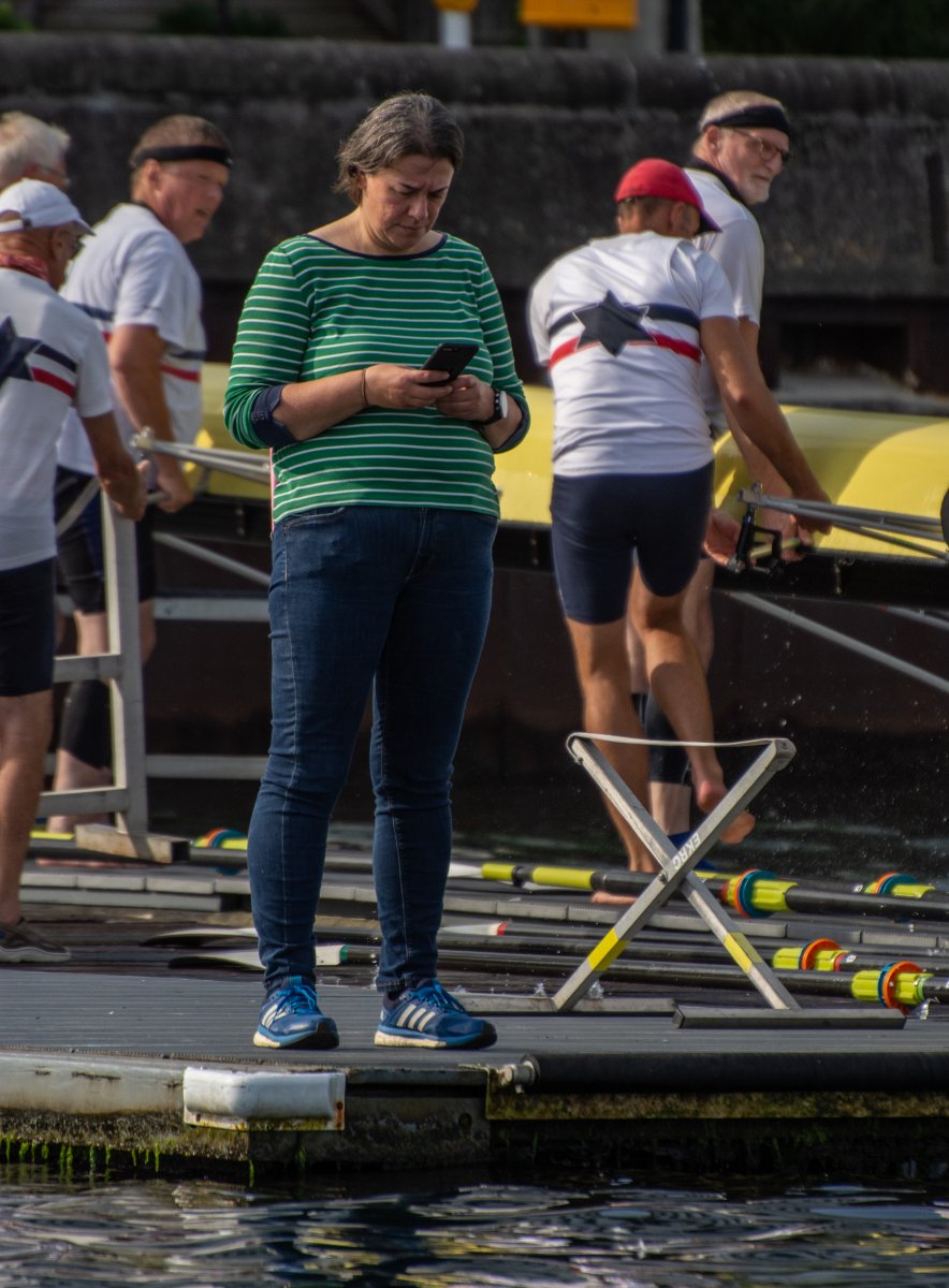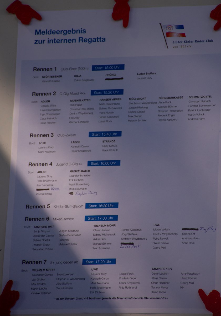Also geht es nach der Begrüßung durch unseren Vorsitzenden direkt aufs Wasser: Die Clubregatten beginnen mit dem Rennen um den Clubeiner. Der anschließend geplante Clubzweier muss nach dem Start abbrechen – es gib Probleme mit einem der Boote. Doch wir sind ja flexibel: Die Zweier zurück an Land, die nächsten Rennen gestartet und in der Zwischenzeit einen anderen Zweier hergerichtet. Die Rennen verlaufen auf dem nahezu glatten Wasser weitgehend reibungslos. Das freut die Ruderer, der Fotograf kommt dadurch allerdings um das ein oder andere sonst gerne genommene dramaturgisch reizvolle »Krebsmotiv« ;-). Schön, dass sich auch dieses Jahr wieder viele Neue, auch Anfänger aus diesem Jahr, in das Renngeschehen getraut haben!