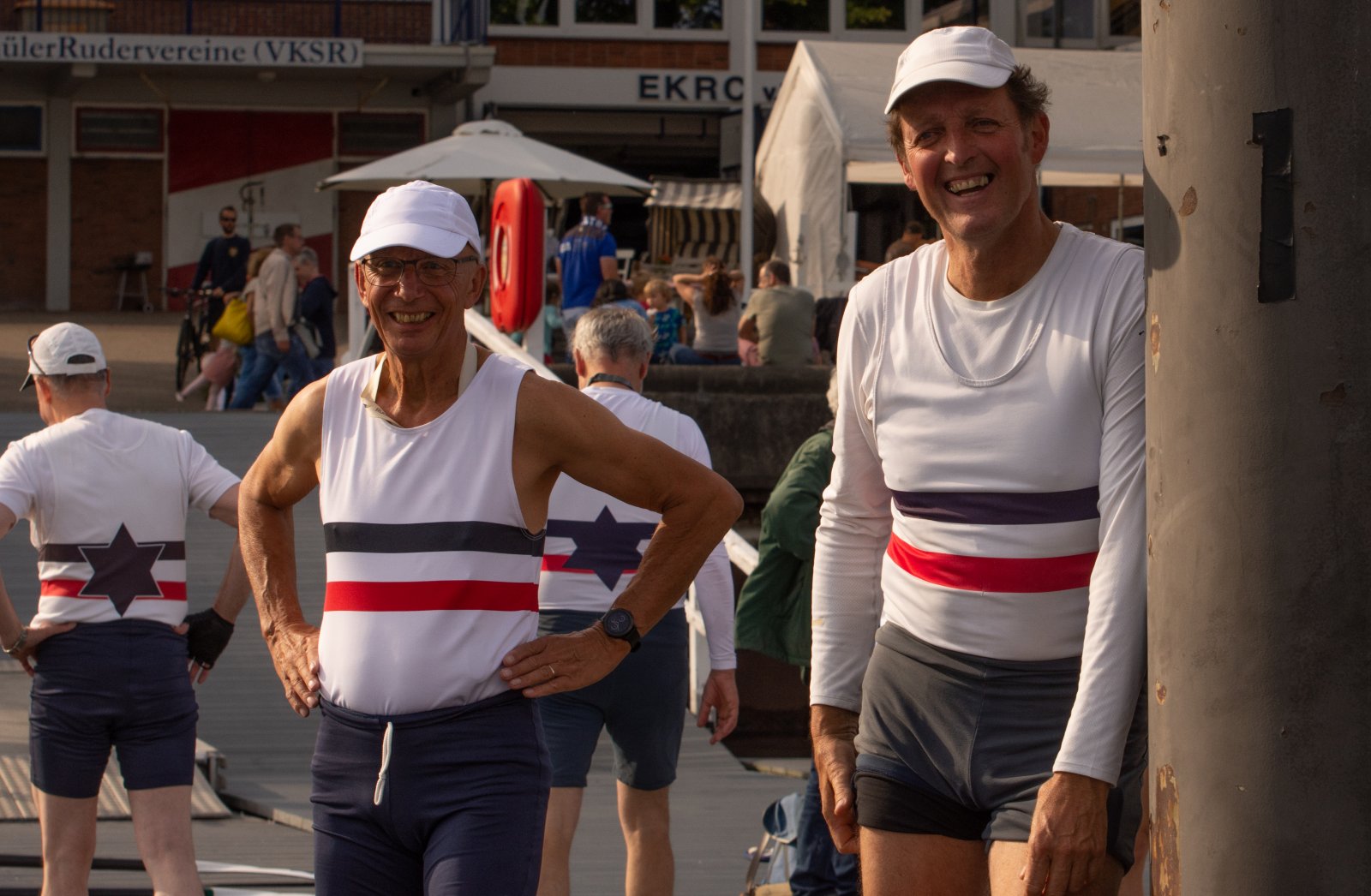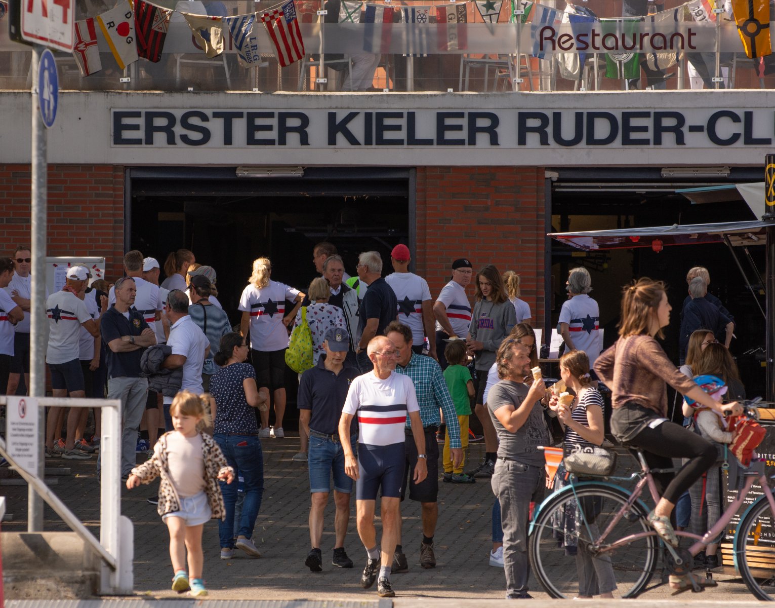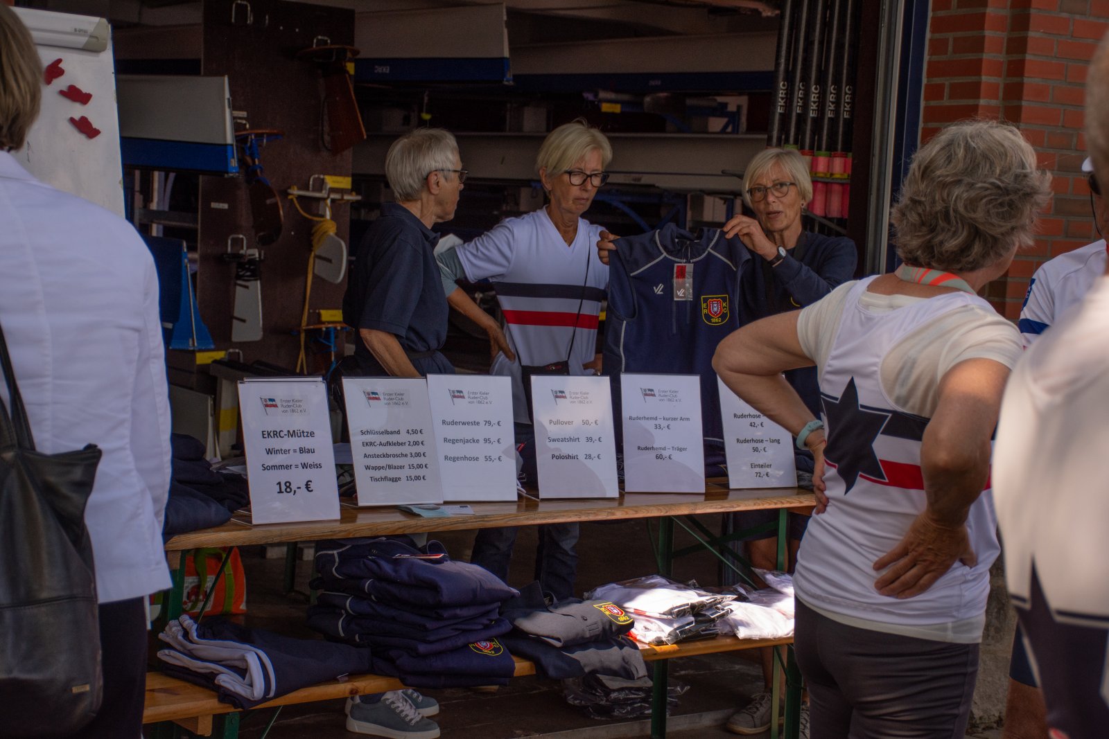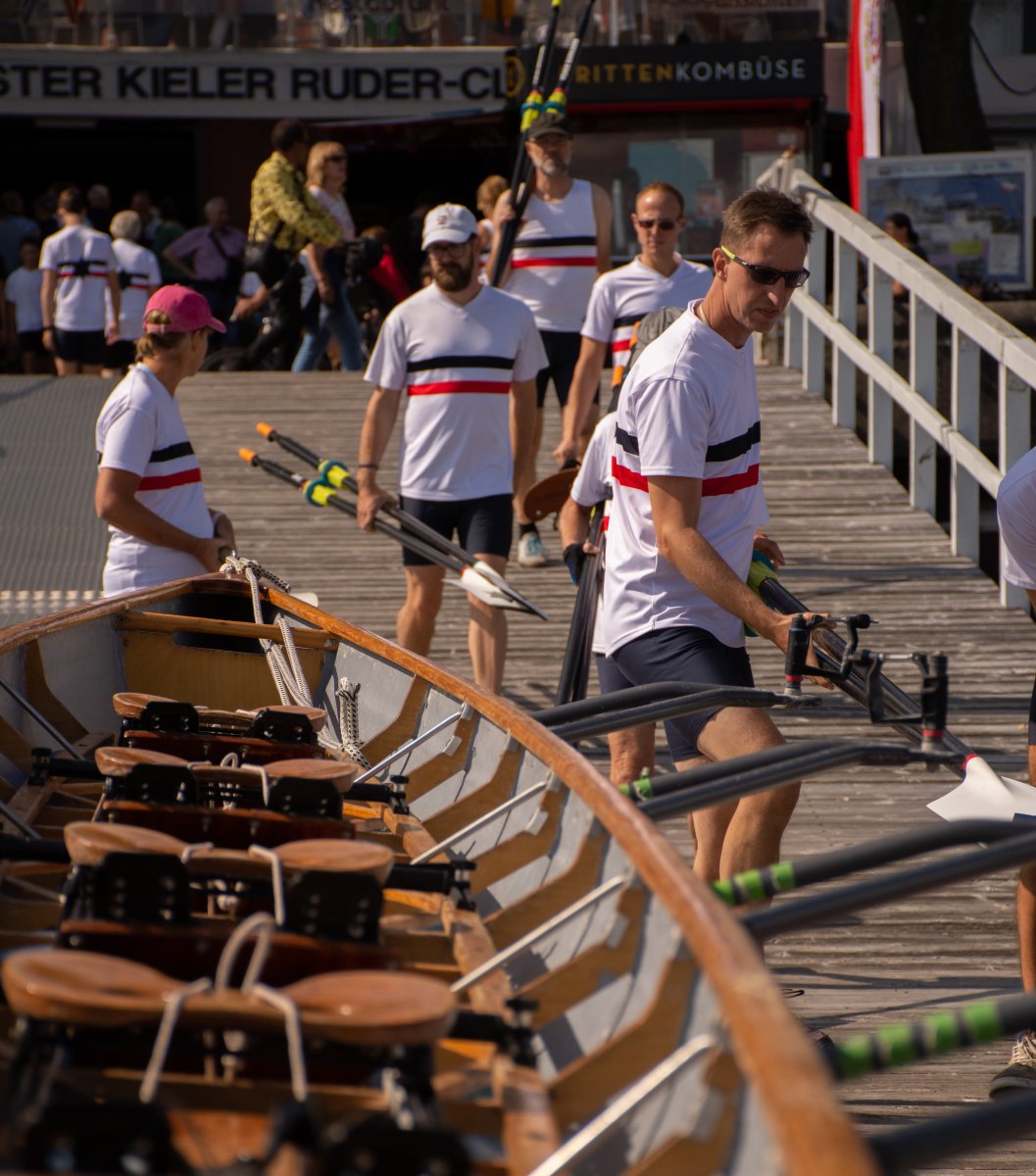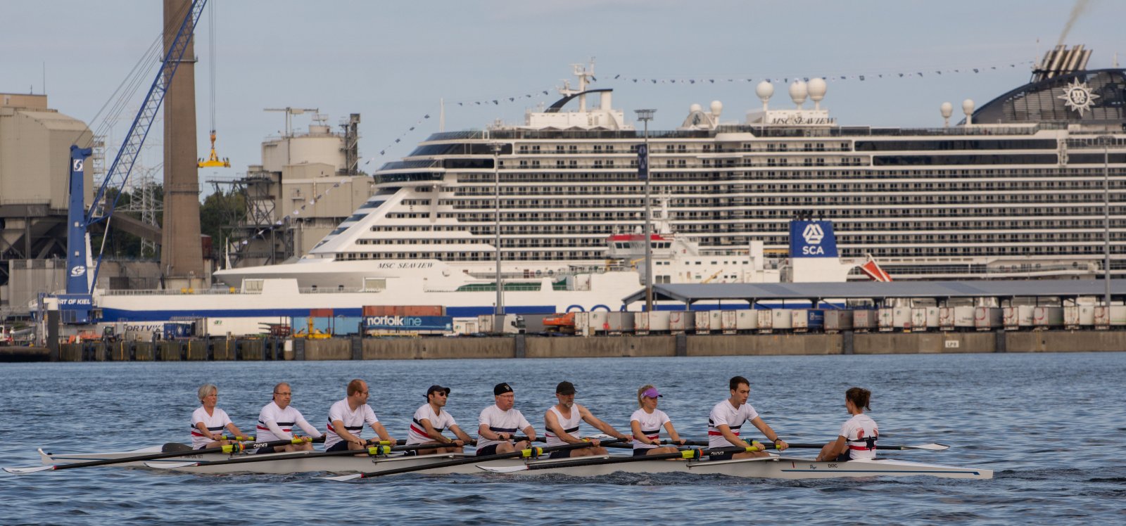 Alles ist wie immer: Der Hafen wird wieder dominiert durch die imposante Kulisse der maritimen Bettenburgen, am Ost- wie auch am Westufer. Der Aida-Kussmund wird wieder eine farbenfrohe Kulisse für den Zieleinlauf unserer Regatten abgeben. Am Club gibt’s Kaffee und Kuchen im Jugendraum, in der Bootshalle die Möglichkeit, sich clubgerecht mit EKRC-Kleidung auszustaffieren, mit Ruder- wie Abendgarderobe. Auf der Wiese das große Zelt und überall Leute, Begrüßungen, »lange nicht gesehen – wie geht es Dir?«, Studium der gelosten Bootsverteilungen und Startzeiten.