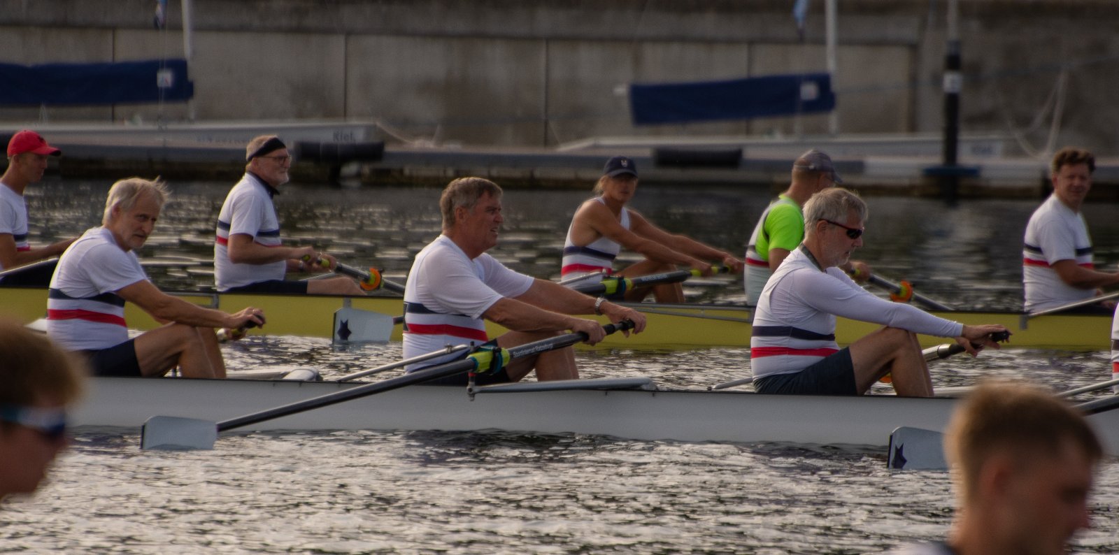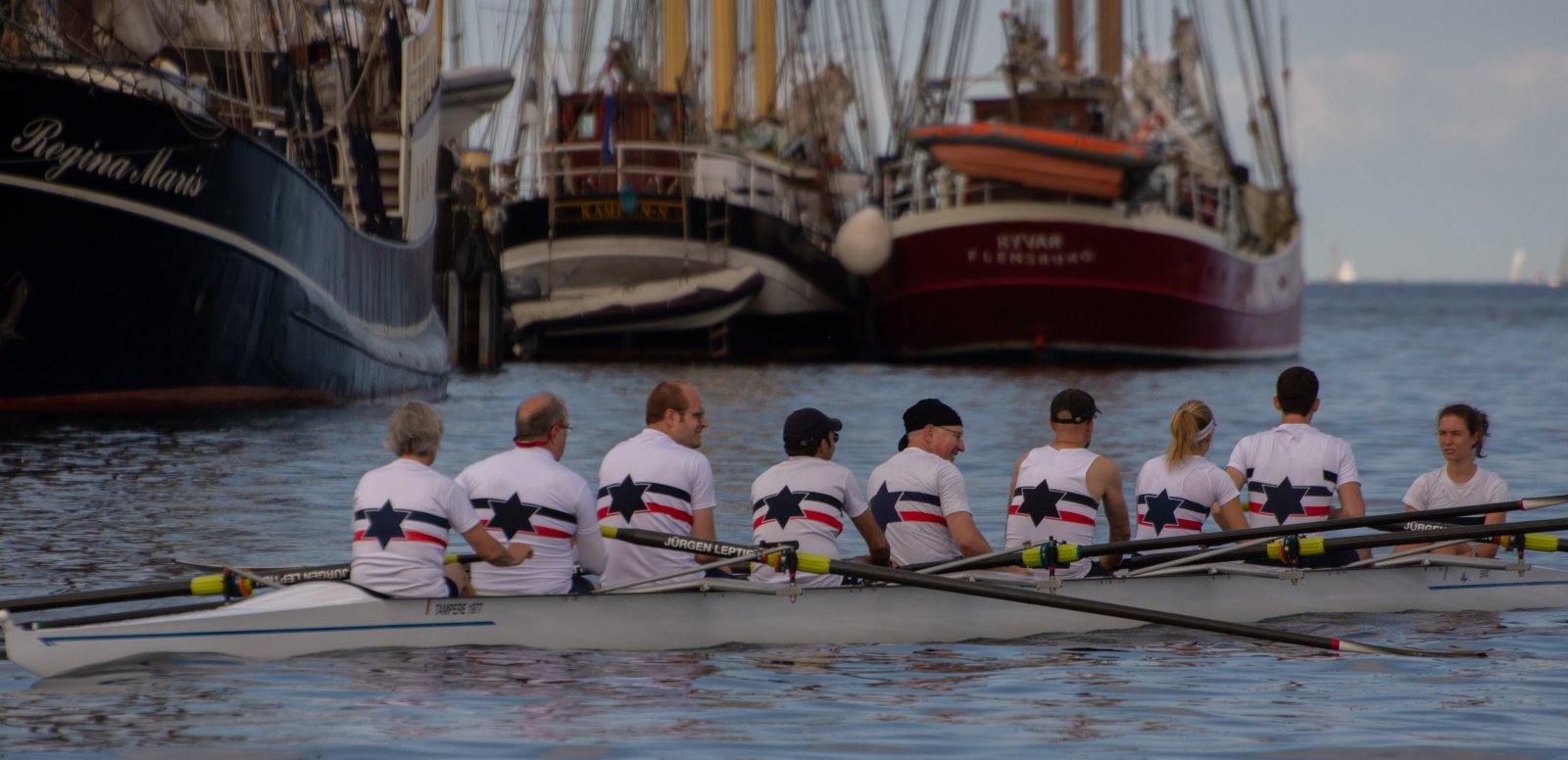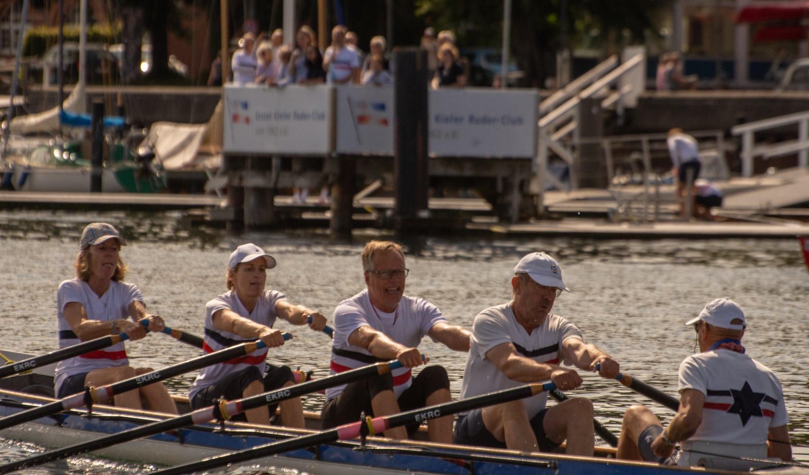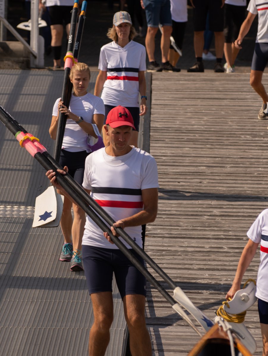 Alles ist wie immer: Der Hafen wird wieder dominiert durch die imposante Kulisse der maritimen Bettenburgen, am Ost- wie auch am Westufer. Der Aida-Kussmund wird wieder eine farbenfrohe Kulisse für den Zieleinlauf unserer Regatten abgeben. Am Club gibt’s Kaffee und Kuchen im Jugendraum, in der Bootshalle die Möglichkeit, sich clubgerecht mit EKRC-Kleidung auszustaffieren, mit Ruder- wie Abendgarderobe. Auf der Wiese das große Zelt und überall Leute, Begrüßungen, »lange nicht gesehen – wie geht es Dir?«, Studium der gelosten Bootsverteilungen und Startzeiten.