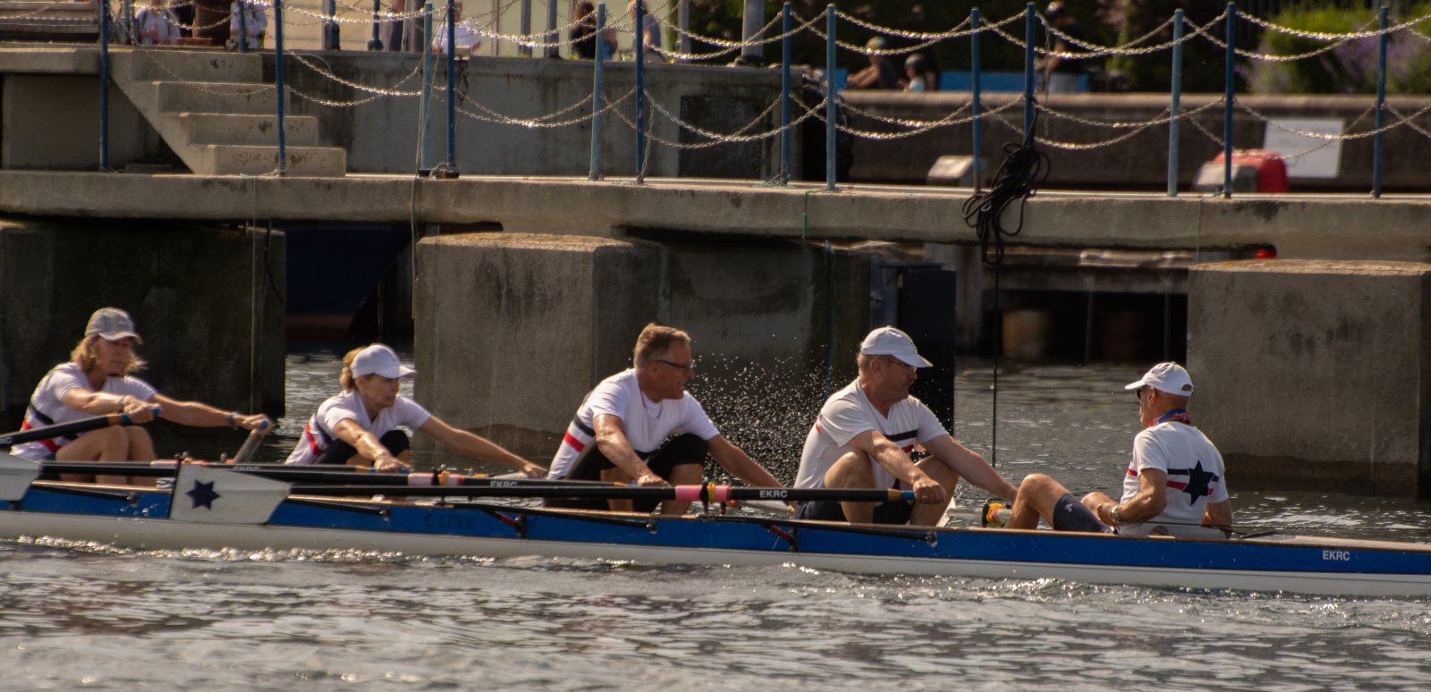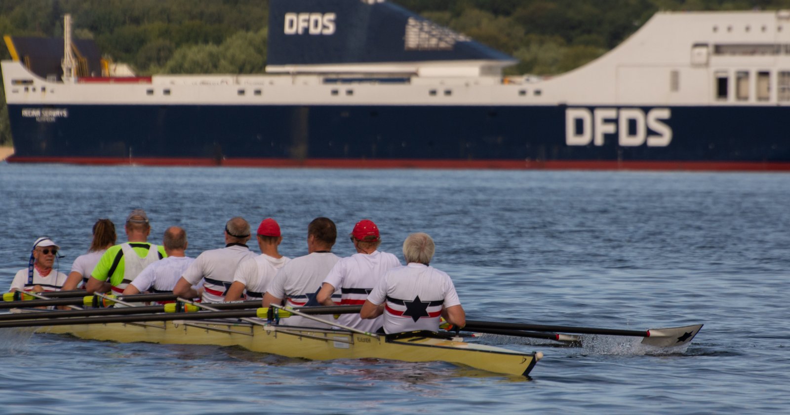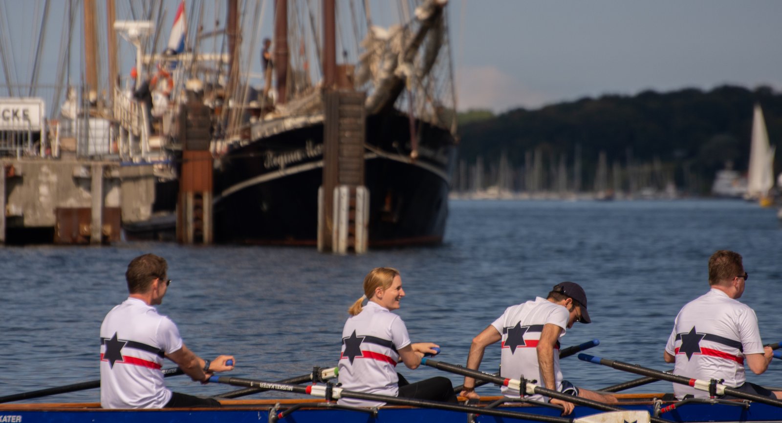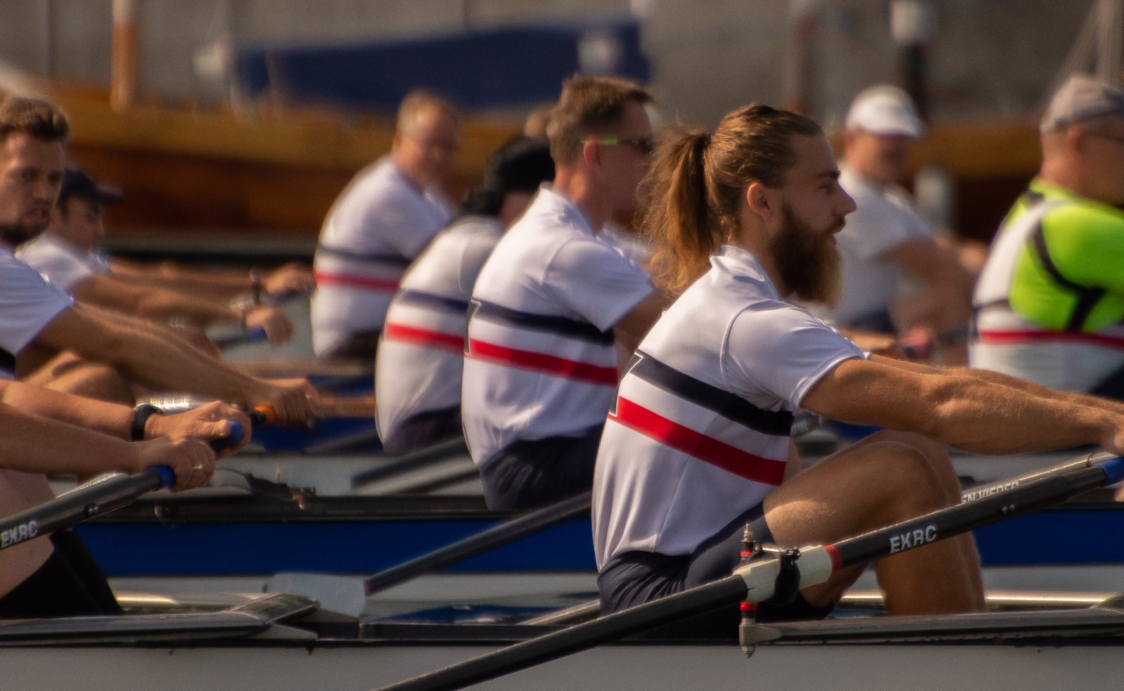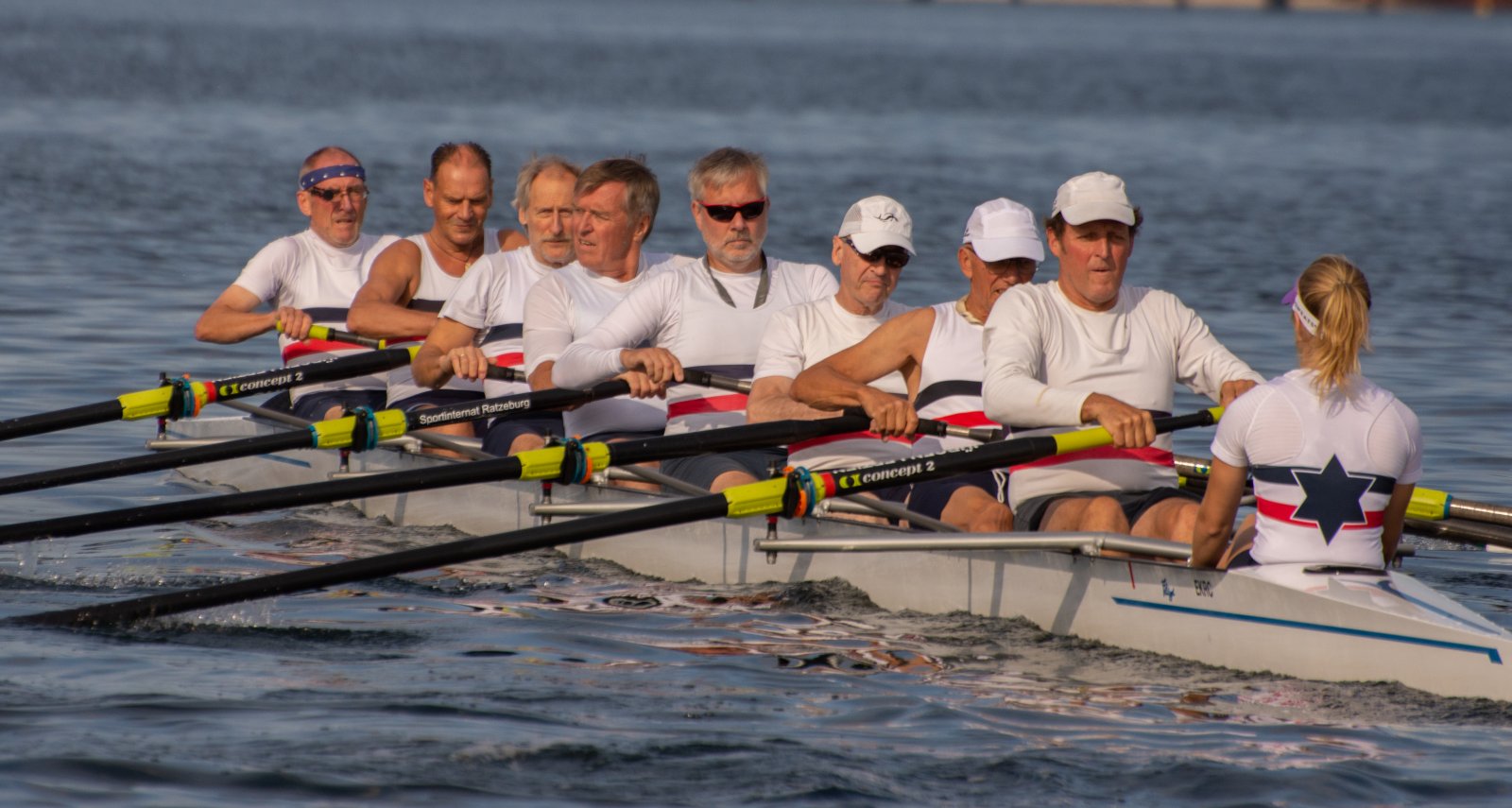 Alles ist wie immer: Der Hafen wird wieder dominiert durch die imposante Kulisse der maritimen Bettenburgen, am Ost- wie auch am Westufer. Der Aida-Kussmund wird wieder eine farbenfrohe Kulisse für den Zieleinlauf unserer Regatten abgeben. Am Club gibt’s Kaffee und Kuchen im Jugendraum, in der Bootshalle die Möglichkeit, sich clubgerecht mit EKRC-Kleidung auszustaffieren, mit Ruder- wie Abendgarderobe. Auf der Wiese das große Zelt und überall Leute, Begrüßungen, »lange nicht gesehen – wie geht es Dir?«, Studium der gelosten Bootsverteilungen und Startzeiten.